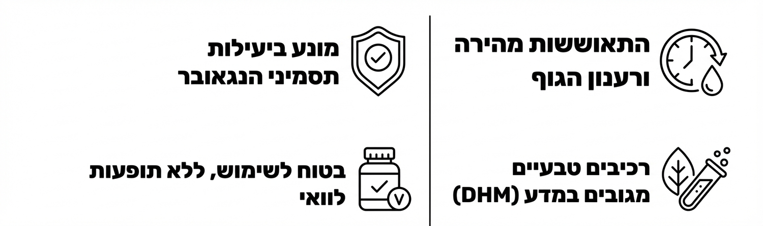 הפורמולה נועדה לפעול בזמן שבו הגוף מתחיל להתמודד בלילה או בבוקר אחרי השתייה ולא להעמיס עליו עוד גירוי חיצוני. במקום לדחוף אנרגיה מלאכותית, היא משתלבת בתהליכים הטבעיים של הגוף.